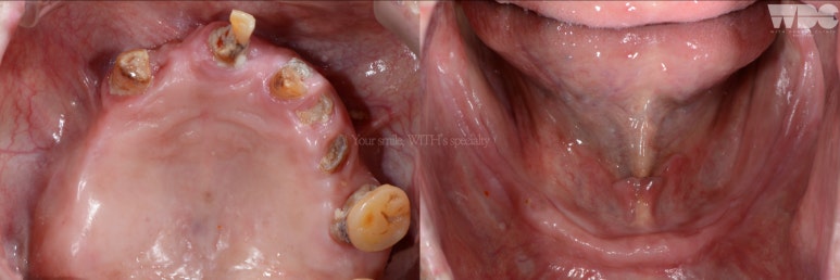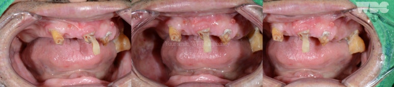 위에 몇개의 치아가 있지만, 모두 심한 충치가 있어 치아머리가 부러지고, 그나마 온전하게 남아있는 하나의 치아도 치조골(잇몸뼈)의 염증이 심해서 많이 흔들려서 그대로 살려서 사용하는게 의미가 없는 상태였습니다.