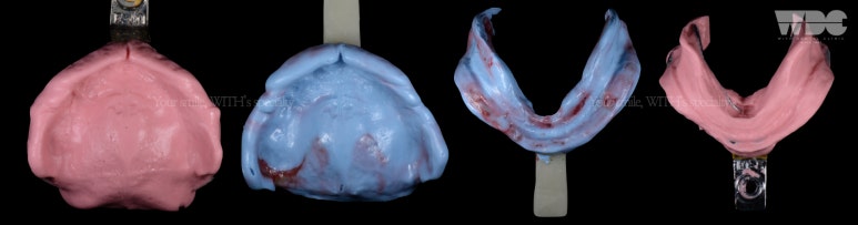 임시틀니를 3개월 이상 사용하고, 발치한 부분이 모두 치유된 후, 최종 틀니를 제작하기위해서 다시 본 뜨는 과정을 진행했습니다. 최종 틀니 제작을 위해서는 두번의 본뜨는 작업이 필요한데요, 위 사진에서 분홍색은 알지네이트라는 재료로 1차 본뜨기 작업을 한 것이고, 가운데 하늘색은 PVS라는 재료로 정밀하게 본뜨는 작업을 진행한 결과물입니다. 잇몸의 형태를 그대로 정밀하게 재현해서 틀니가 제작되어야 틀니가 입안에서 제대로 기능하고 불편감을 최소화할수 있기 때문에 최종틀니 제작시에는 반드시 2번의 본뜨는 과정을 거칩니다.